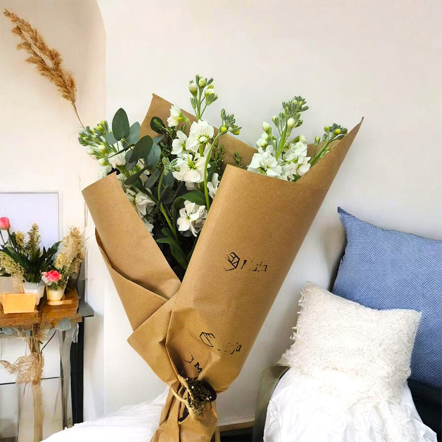 Ramo con 6 Alelies, selección de follajes envuelto en papel Kaft.