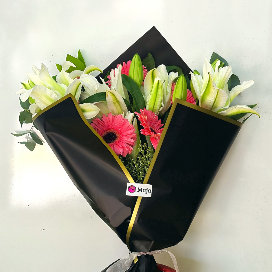 Ramo con Liium, Gerberas y selección de verdes, lleno de encanto y emoción